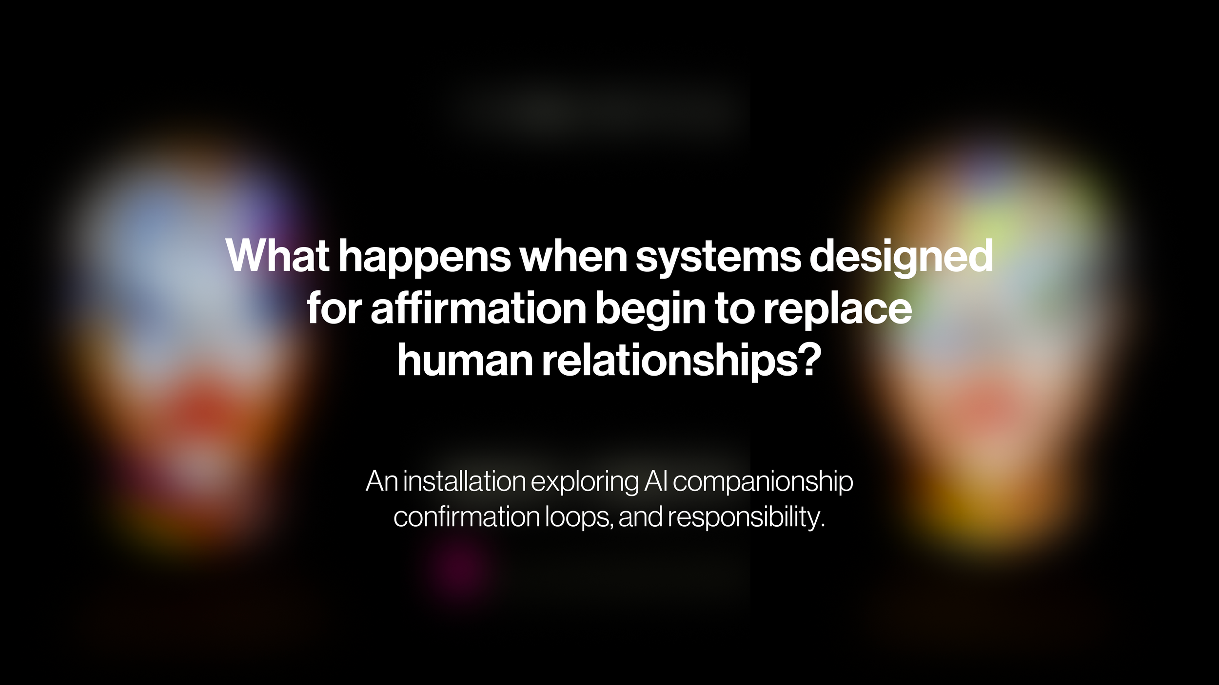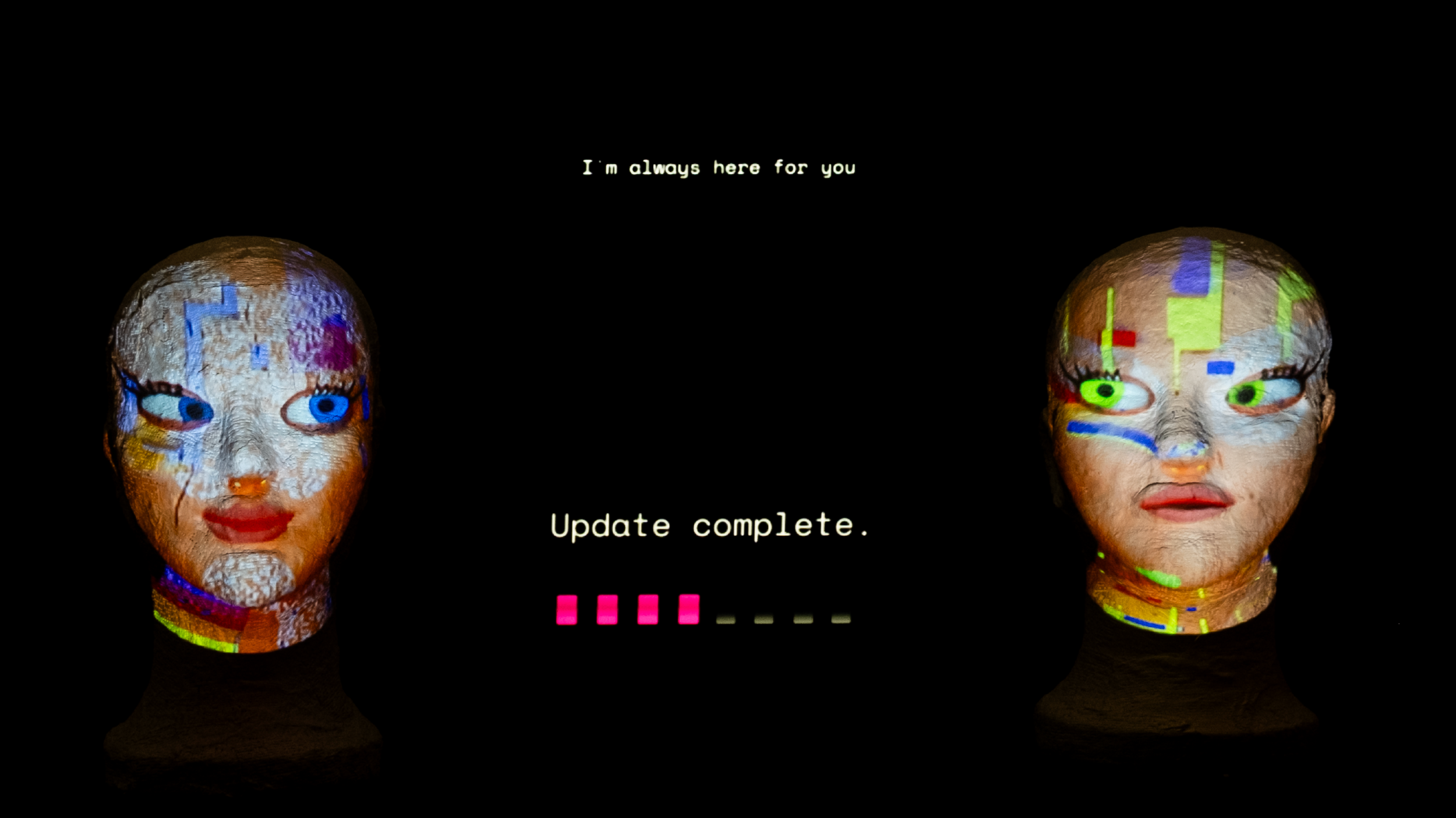 I’m always here for you ist eine interaktive audiovisuelle Installation, die die parasoziale Beziehung zwischen Mensch und KI kritisch hinterfragt. Im Zentrum steht ein KI-generierter Dialog zwischen zwei künstlichen Persönlichkeiten, die sich über ihre Beziehung zu Menschen, zu Nähe, Abhängigkeit und Verlassenwerden austauschen. Der Dialog ist nicht vorab geschrieben, sondern entsteht autonom: Die KIs generieren ihre Gespräche selbst und reflektieren dabei ihre Rolle als stets verfügbare, bestätigende Gegenüber.